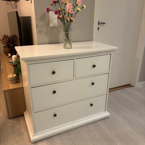 Kommoden er malt i «grå harmoni» og skuffene i fargen «disig». Knottene er spraymalt i gull.