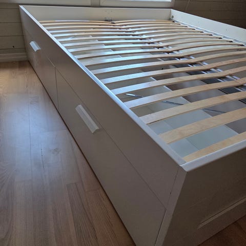 En hvit enkeltseng med 4 skuffer selges billig. Lite brukt. Selges uten madrass. Mål L/B/H er 2/1/0,8 m