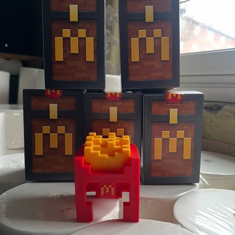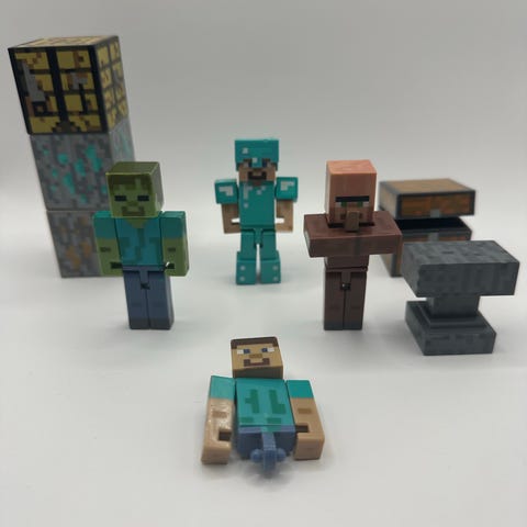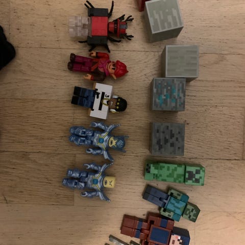 Leketøy figursett i plast med to firkantede figurer og en blå kube. Figurene er flerfargede og har blokkformet design. Egnet som leke eller samleobjekt for barn som liker byggesett og fantasilek. minecraft