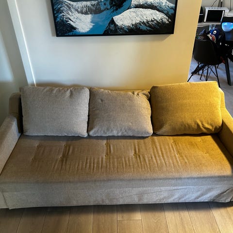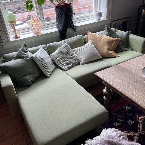 Usikker hvor sofa er kjøpt. Står i en leilighet på bakkeplan, der man kan kjøre helt fram til inngangen. Du må ha henger eller varebil for å frakte den.