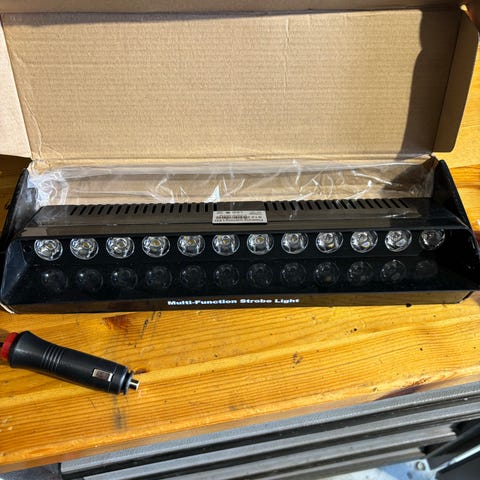 LED varsellys sett med flere lysmoduler, kontrollboks og bryter. Settet består av avlange LED-lys med klar linse og sort hus, tilpasset montering på kjøretøy eller andre flater der ekstra varsling eller markeringslys er ønsket. Kontrollboksen har flere utganger for tilkobling av lysene, samt bryter med knapp for styring av lysfunksjoner. Egnet for bruk der det er behov for ekstra synlighet, for eksempel på arbeidskjøretøy eller ved midlertidig varsling. Strømtilkobling og festeutstyr må tilpasses aktuell montering.