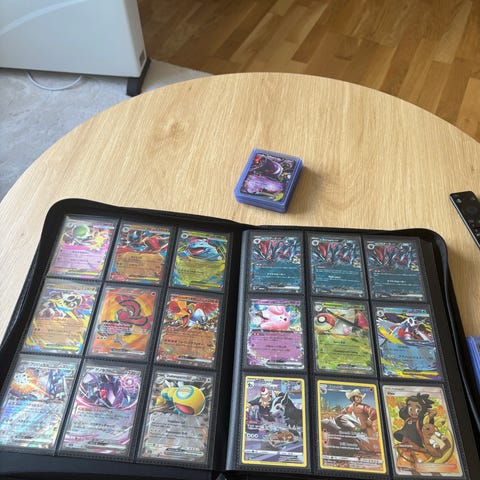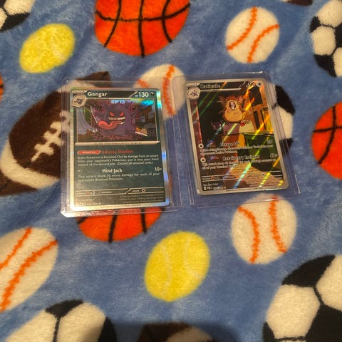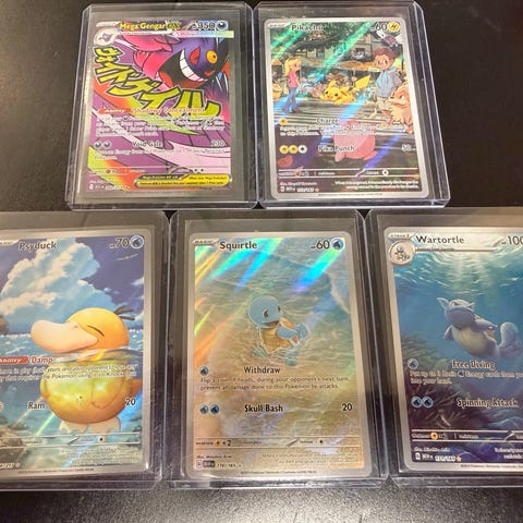 Pokémon samlekort med motivene Mega Gengar EX, Wartortle, Mew og Psyduck. Kortene viser ulike illustrasjoner og angrepstekster på engelsk. Egnet for samling eller bruk i Pokémon Trading Card Game. Eventuelle sett, utgaver og årganger fremgår av teksten på kortene og kan kontrolleres nærmere på bildene.