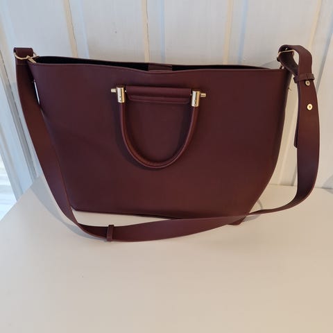 Ubrukt og stilig Armani skinnveske for dame i burgunderfarget lær. Vesken har doble hanker og avtakbar skulderrem, som gir mulighet for både håndbæring og skulderbæring. Midtrommet lukkes med glidelås, og innvendig er det to hovedrom mindre rom som egner seg til laptop/nettbrett, bøker. Passer til hverdagsbruk, jobb og enklere reiser der det er behov for en romslig veske.