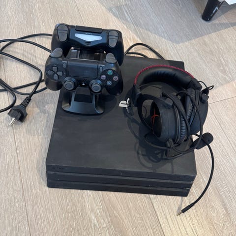 Sony Playstation 4 Pro spillkonsoll med to DualShock 4 trådløse kontrollere og HyperX gamingheadset med mikrofon.