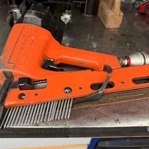 Workman spikerpistol pneumatisk i blå farge. Verktøyet drives med trykkluft via standard luftkobling. Magasinet er vinklet og beregnet for spikerbånd, egnet til ulike snekker- og tømrerarbeider som montering av reisverk, lekter og lignende trearbeid. Leveres med spikerpistol og magasin, samt en pakke spiker som vist på bildene.