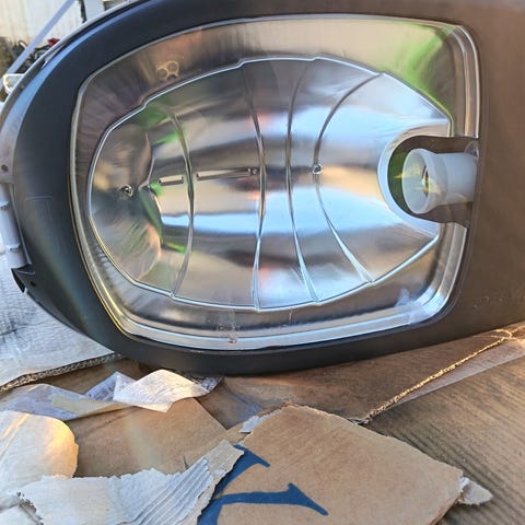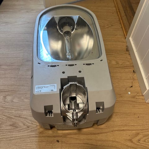 Gatelykt utendørs armatur i grå farge. Armaturet har stor, klar/skjermet frontkuppel og er beregnet for montering i mast eller på brakett. Egnet til belysning av vei, gårdsplass eller lignende uteområder. Strømtilkobling og lyspære/lyskilde er ikke spesifisert og bør kontrolleres før bruk. Ytre materiale er hardplast/kompositt med lukket kuppel over lyskilden.