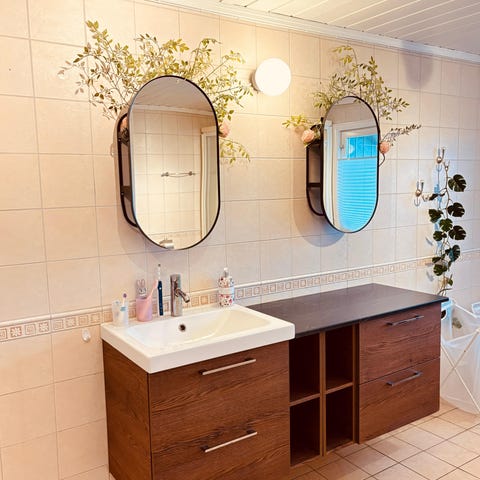 Ithaka baderomsmøbel med speil og servantskap. Settet består av et vegghengt speil og et kompakt servantskap med servant på toppen. Passer til mindre baderom eller gjestetoalett. Farge og eksakte mål fremgår ikke tydelig av bildet og bør kontrolleres mot emballasje eller produsentinformasjon.