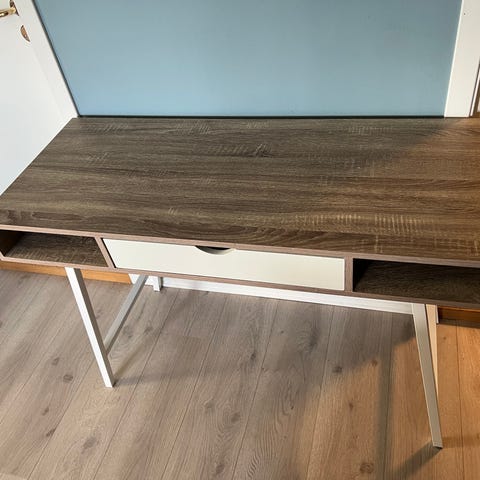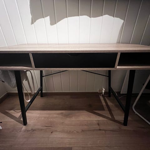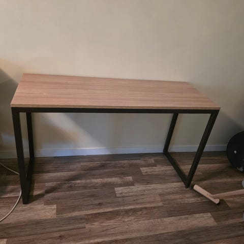 Rektangulært skrivebord med bordplate i treimitasjon og understell i svart metall. Bordet har enkel, åpen ramme med kryssavstivning på baksiden for stabilitet. Egnet som arbeidsbord, skrivebord eller konsollbord i hjemmekontor, stue eller soverom. Nøytral utførelse som passer til ulike innredningsstiler.