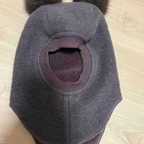 HUTTEliHUT balaclava i ull i størrelse 2-4 år for barn, unisex. Jeg har forsterket den ene dusken med å sy den, da den var litt løs.