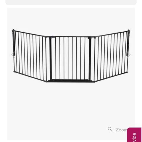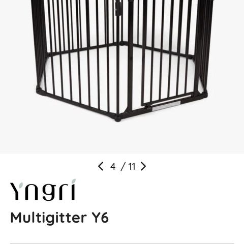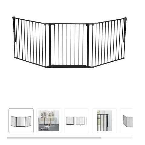 Yngri peisgrind i svart metall. Grindens seksjoner kan vinkelsjusteres for å skjerme peis eller andre områder i rommet. Består av flere paneler med vertikale spiler og en åpning med låsbar dør. Kan festes i vegg med medfølgende fester. Egnet som sikkerhetsgrind innendørs for å avgrense område rundt peis eller lignende.