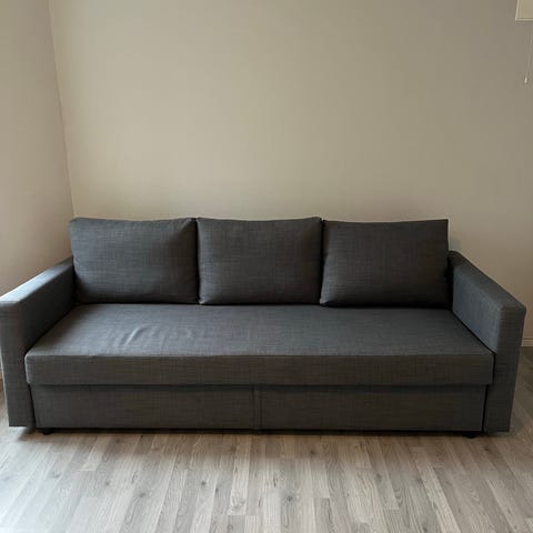 Pent brukt sovesofa i nøytral grå farge.