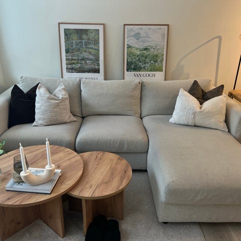 Hjørnesofa, med sjeselong. God å sitte i, enkel å støvsuge. Settes sammen lett. Perfekt til powernaps.