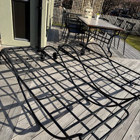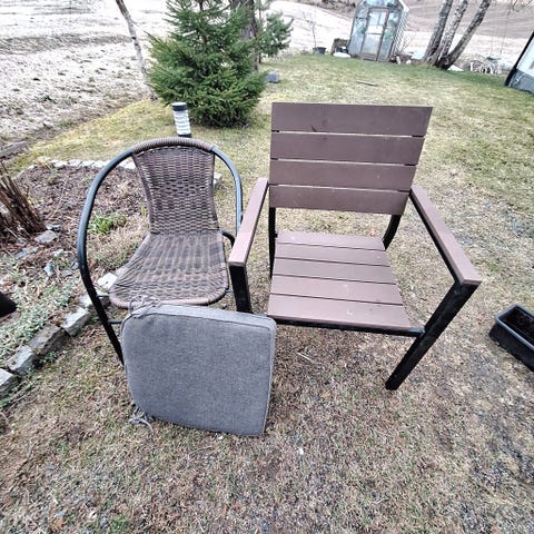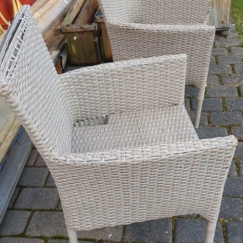 2s toler med grå ramme i metall og sete/rygg i flettet materiale.