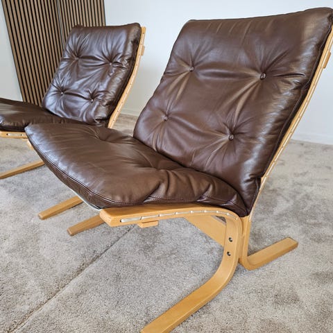 I 1965 designet den anerkjente møbeldesigneren Ingmar Relling sitt hovedverk: SIESTA-stolen. Vi selger 2 stk med helt nytrukket skinn i 2025