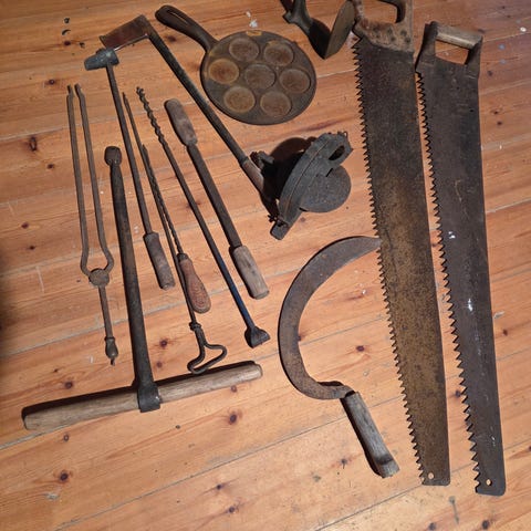 Selger en flott samling med antikke og gamle gjenstander som passer perfekt til kunst, hytte, naust eller rustikk interiør. Her er blant annet gamle jernredskaper, vaskebrett og gårsutstyr med mye sjarm og historie