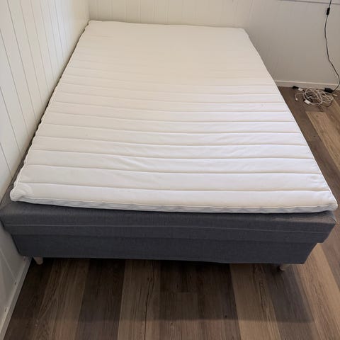 selger seng fra Ikea 120x200. Selve rammemadrassen er brukt i omtrent 2 år, mens overmadrassen akkurat er byttet ut med en ny, og er derfor lite brukt.