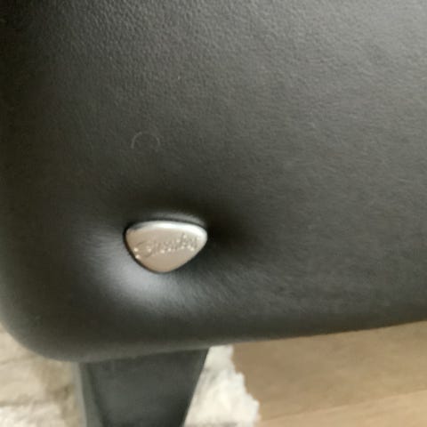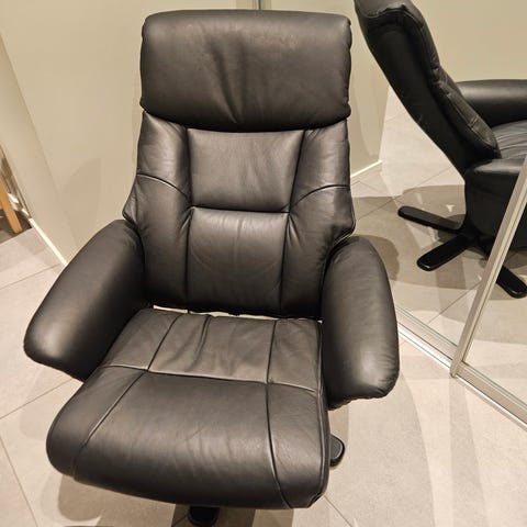 Hjellegjerde lenestol med fotskammel i svart skinn. Stolen har høy rygg med vingeformet topp og polstrede armlener. Sete og rygg er trukket i svart skinn med synlige sømmer. Understell i metall med kryssfot gir dreiefunksjon på stolen. Fotskammelen har matchende svart skinn og metallunderstell med kryssfot. Egnet som hvilestol i stue, TV-krok eller lesehjørne.har bare en skammel. De kan selges separat.