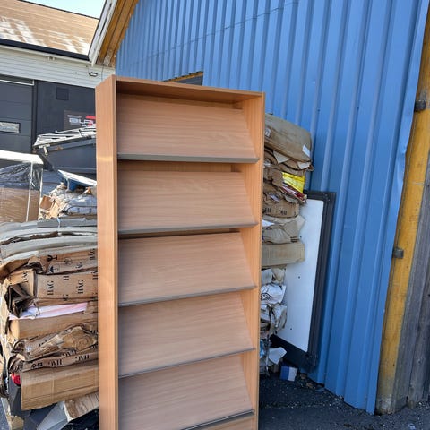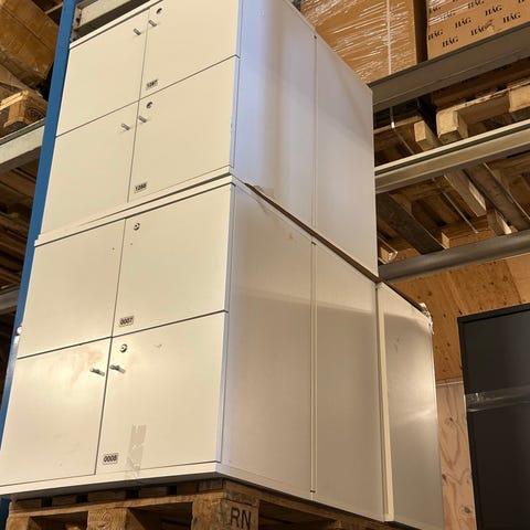 Hyllemoduler bokhylle i lyst brunfarget treverk. Består av åpne hyller øverst og lukkede seksjoner nederst med nedfellbare fronter. Egner seg til oppbevaring av bøker, permer og annet utstyr i stue, kontor eller lager. Modulene kan plasseres ved siden av hverandre for å bygge en større reol etter behov.