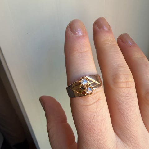 Unik vintage gullring i 14K gull med 3 små diamanter i størrelse 64 selges for 2100 kroner (fast pris). Ringen er brukt og derfor har noe slitasje, men ser fortsatt lekkert ut. Innvendig diameter er 2 cm (se bilder).