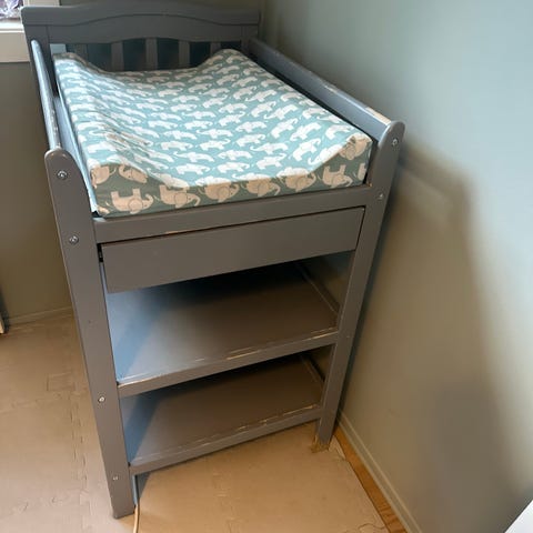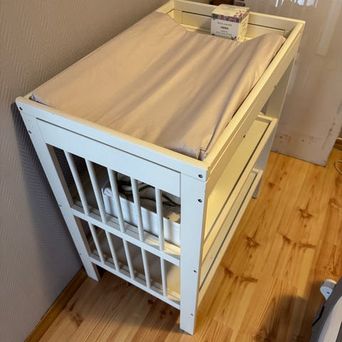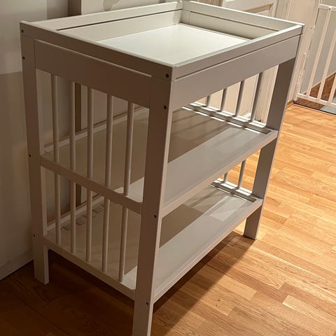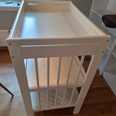 IKEA stellebord i hvit utførelse. Stellebordet har to åpne hyller under stelleflaten som gir plass til oppbevaring av bleier, klær og annet babyutstyr. Åpen konstruksjon med sprosser på sidene. Egnet til bruk på barnerom eller bad der det er behov for en fast stelleplass.