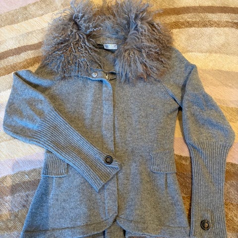 Vintage jakke med hette og myk pelskant langs åpning, ermer og nederkant. Den har et fint belte i midjen som gir en unik og varm look.