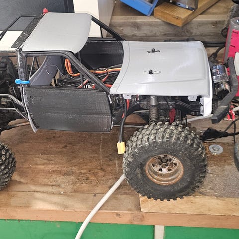 Settet inneholder et radiostyrt bilchassis med grovmønstrede dekk, forbrenningsmotor merket OS Maxx og en Graupner Varioprop C4 27 MHz fjernkontroll. Fjernkontrollen er merket SSM 27 og MF-7179. Bilen ser ut til å være et hobby-/modellbilchassis for nitrodrift med mekaniske komponenter som motor, drivverk og hjul montert.