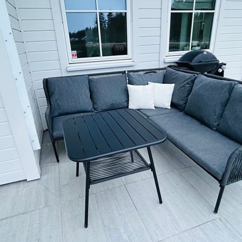 Bordet har målene 72,5x72,5x66 cm (LxBxH). Sofaen består av tre deler.