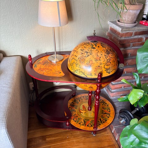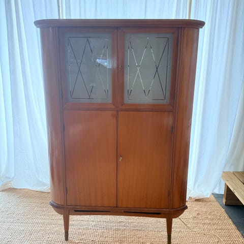 Tønneformet barskap i tre med messingdetaljer. Skapet står på stativ med hjul for enkel flytting. Innvendig har det hyller og rominndeling til flasker og glass, samt utfellbare holdere på sidene. Passer som oppbevaring av drikkevarer og glass i stue eller kjellerstue.