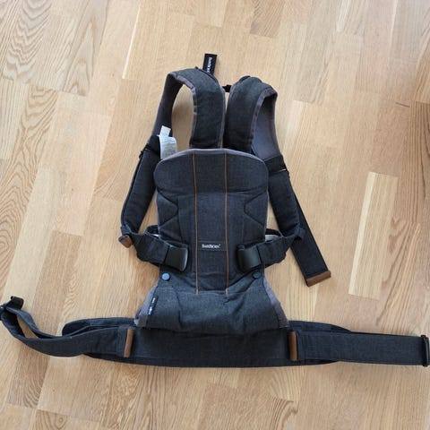 BabyBjörn bæresele i grå tekstil. Selen har polstrede skulderstropper og bredt, justerbart hoftebelte med plastspenne. Flere justeringsmuligheter for god passform rundt kropp og skuldre. Egnet til å bære barn tett inntil kroppen. Stoffmateriale i myk tekstil med støtte rundt rygg og hode for barnet.