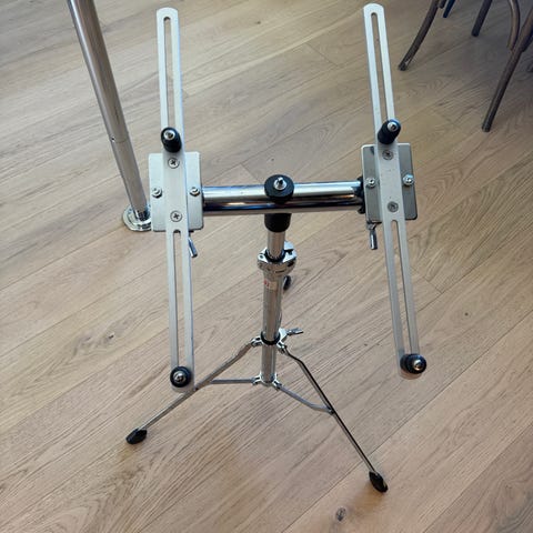 Cymbalstativ med boom-arm i krommet metall. Stativet har justerbar høyde og vinkel på armen, med standard gjengefeste for cymbalholder på toppen. Trefots bunn med doble ben gir stabilitet. Egnet som del av trommesett til montering av ulike typer cymbaler.