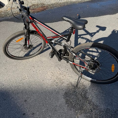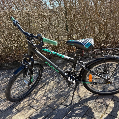 Barnesykkel med 20" hjul i rød og svart farge. Sykkelen har rette styre og standard pedaler. Passer til barn som trenger en sykkel i 20" størrelse til bruk på vei og lett grus. Utstyr og girutveksling fremgår av bildene. brukt 2 gange.