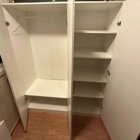 1 skap med hyller på den ene siden og for henging på andre side. 1 skyvedør