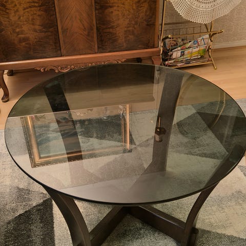 8-kantet bord i kombinert mørkt tre og glass selges. Noen bruksmerker, men stilfullt flott bord. 80x80 cm, høyde 53 cm. Står på Charlottenlund, Trondheim.