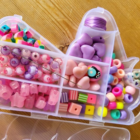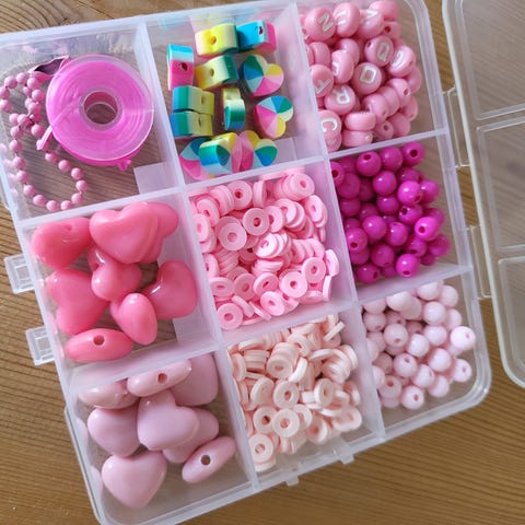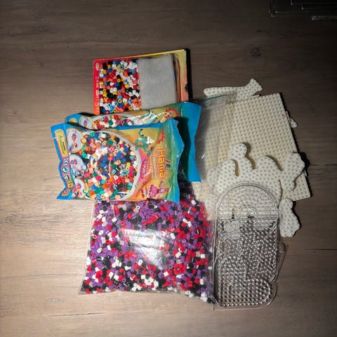 Det er også smykke perler bokstaver i ene rommet som kan brukes til å lage smykke med tekst. Kan hende det er flere perlebrett som kan følge med, men i første omgang er det kun den som er funnet. Og det vil være mer perler som kan tilføyes, men ikke er med på bildet.
