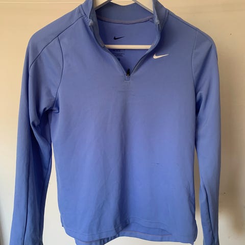 Nike Dri-FIT genser i størrelse 158 - 170 cm. Langermet overdel i blå polyester med halv glidelås i halsen. Genseren er laget i teknisk Dri-FIT-materiale som transporterer fuktighet bort fra kroppen. Passer til trening, fritid og andre aktiviteter for barn i aktuell høyde/aldersgruppe.