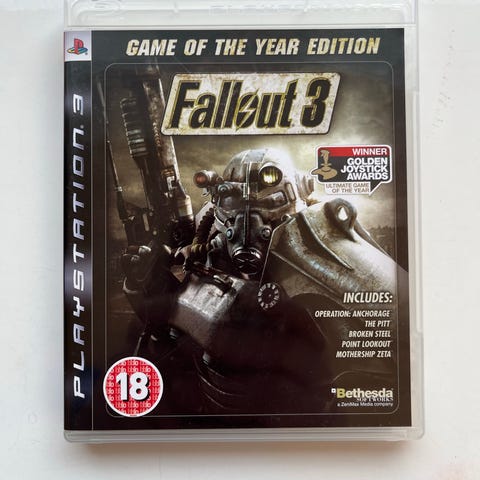 Bethesda Fallout 3 Game of the Year Edition Playstation 3 spill. Fysisk utgave i PS3 Essentials-serien med omslag og spilldisk. Aldersgrense 18 år (PEGI 18). Versjonen inkluderer hovedspillet Fallout 3. Spilltype: actionrollespill satt til et postapokalyptisk univers. Plattform: Playstation 3 (PS3). Språk og tekst kan variere etter region, se omslag for detaljer.