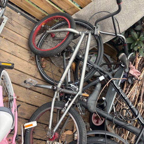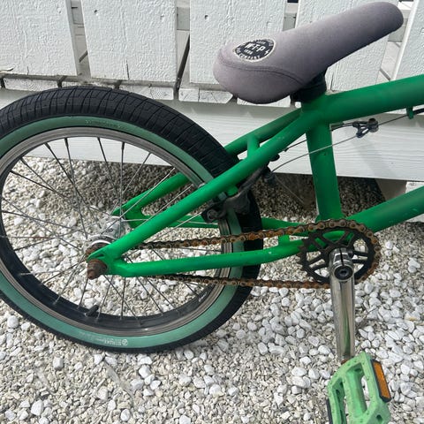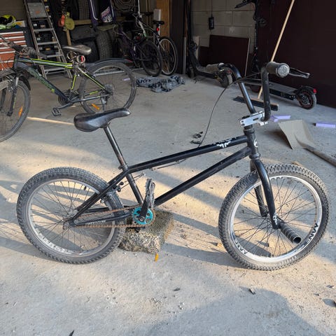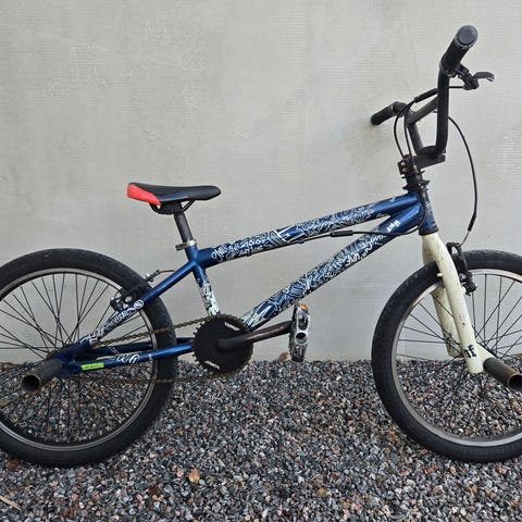 Den er grei og kjøre men nå er begge dekka uten luft. Den er en 20 størelse