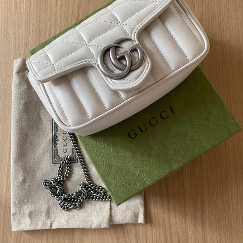 Dette er en ekte Gucci GG Marmont Super Mini i matelassé-skinn med det ikoniske Double G-spennet. Vesken har en avtagbar skulderstropp i kjetting og et fôr i semsket mikrofiber med innebygd nøkkelring som kan festes til en større veske.