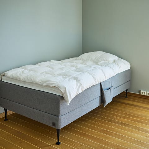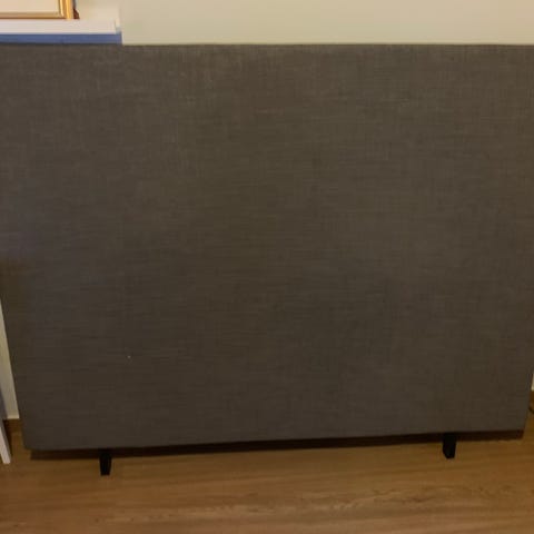 Grå sengegavel i stoff og polstring. 140cm bred og 120cm høy.