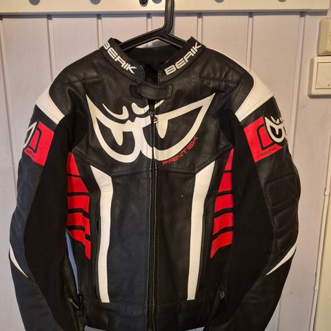 Berik mc-jakke i skinn i hvit og svart farge. Jakken har glidelåslukking foran og høye kragekanter. Modellen har flere paneler og sømmer for bedre passform, samt kontraststriper og logoer på bryst og skuldre. Egnet som kjørejakke til motorsykkel med fokus på beskyttelse og slitestyrke. Passer for voksen fører; kjønn er ikke spesifisert.