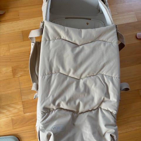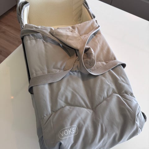 Voksi babylift i beige farge. Babyliften har polstret innside og håndtak for bæring. Glidelås langs sidene gjør det enkelt å åpne og lukke liften. Egnet til bruk i barnevogn eller som bærebag til spedbarn, innenfor vekt- og sikkerhetsanbefalingene fra produsenten. Stoff og polstring gir barnet en myk og omsluttende liggeplass.