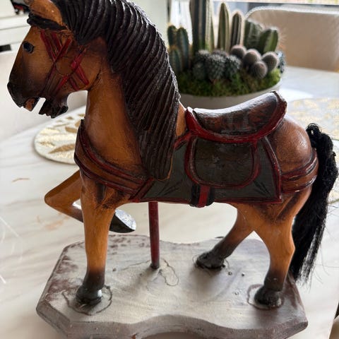 Ukjent merke utskårne hestehoder dekorfigur tre