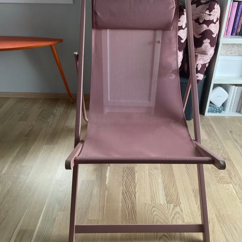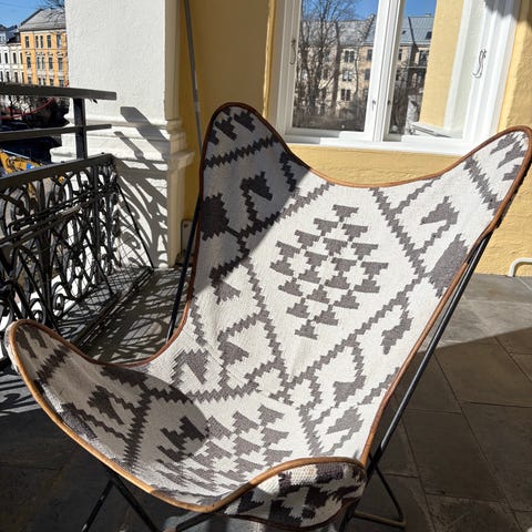 Sammenleggbar sommerfuglstol med svart metallramme og sete i tekstil med svart og hvitt geometrisk mønster. Stolen har kryssformet understell for stabilitet og høyt ryggstykke som gir støtte til rygg og nakke. Egner seg til bruk på terrasse, balkong, hage eller som ekstra sitteplass innendørs. Stofftrekket er festet til rammen og kan tas av ved behov for rengjøring eller utskifting, avhengig av utførelse. Hentes på 2034 Holter.