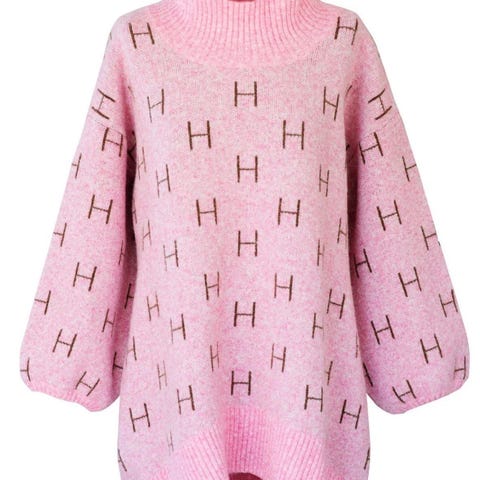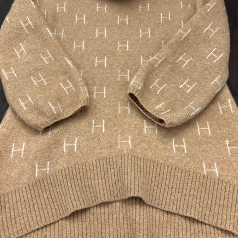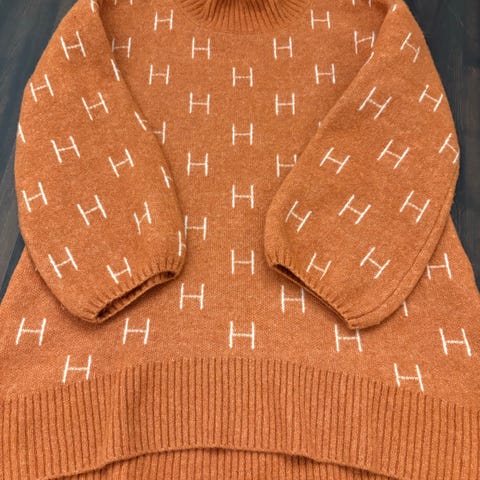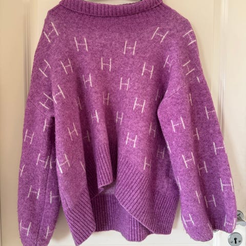 HÉST høyhalset genser for dame i størrelse S. Genseren er strikket i en ullblanding og har høy hals og ribbestrikkede kanter. Den har flerfarget design med kontrastfarge i ribb og gjentakende H-mønster over hele genseren. Passformen er romslig med senkede skuldre og vide ermer som smalner inn ved mansjettene. Egnet til hverdagsbruk og som varm lag-på-lag genser i kjøligere vær.