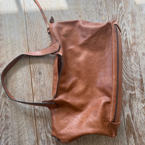 Selger en klassisk og praktisk skulderveske fra merket Puccini. Vesken er i en fin, dyp brunfarge.