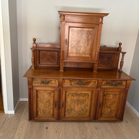Skjenk i tre i brun utførelse. Antikvitet fra 1930- tallet. Møbelet har rett topp med opphøyd kant og utskårne dekorative detaljer på bakkanten. Fronten består av tredører med innrammede felt og utskårne ornamenter. Skjenken står på lave ben og gir god oppbevaringsplass bak dørene. Passer til bruk i stue, spisestue eller gang for lagring av servise, tekstiler eller andre gjenstander.