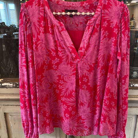 Springfield bluse for dame i størrelse 42. Blusen er lilla med blomstermønster og har lange ermer med strikk og liten volang nederst. V-utringning foran og knappestolpe i vakre perlemorknapper. Stoffet fremstår som lett og velegnet til hverdagsbruk eller kombinert med penere underdel. Passer til bruk året rundt, alene eller under jakke eller cardigan.
