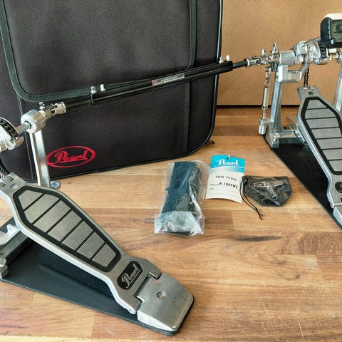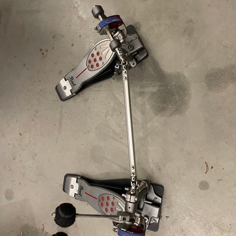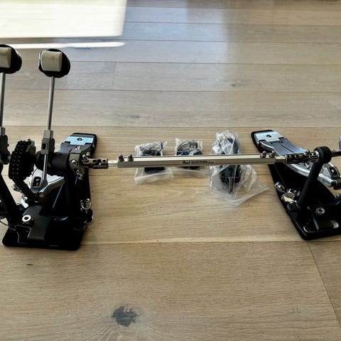 Double-pedaler i fungerende stand. I tillegg er par Quad-head Beater, Red Cams og Millenium robust pedal bag.