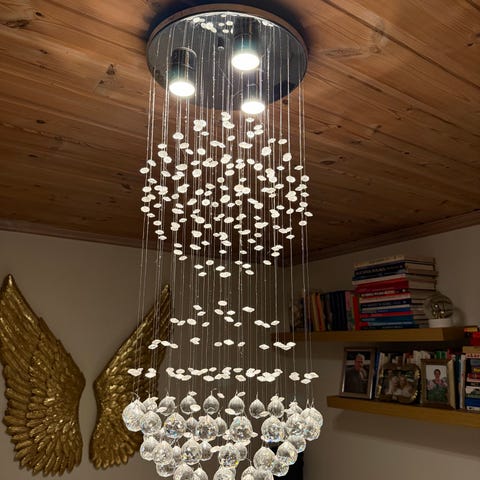 2 taklamper selges, kjøpt på Lampehuset. Kr 600 for begge. 64 cm rundt lampene.