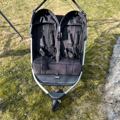Selger pent brukt Thule Urban Glide 2 Double -søskenvogn i svart. Vognen har to separate sitteenheter ved siden av hverandre med justerbare seler og kalesjer. Store luftfylte hjul og svingbart forhjul gir god manøvrering. Håndbrems på styret gir ekstra kontroll ved kjøring i bakker. Under vognen er det en romslig handlekurv med lokk og glidelåslomme. Egnet som sports- og hverdagsvogn for to barn.